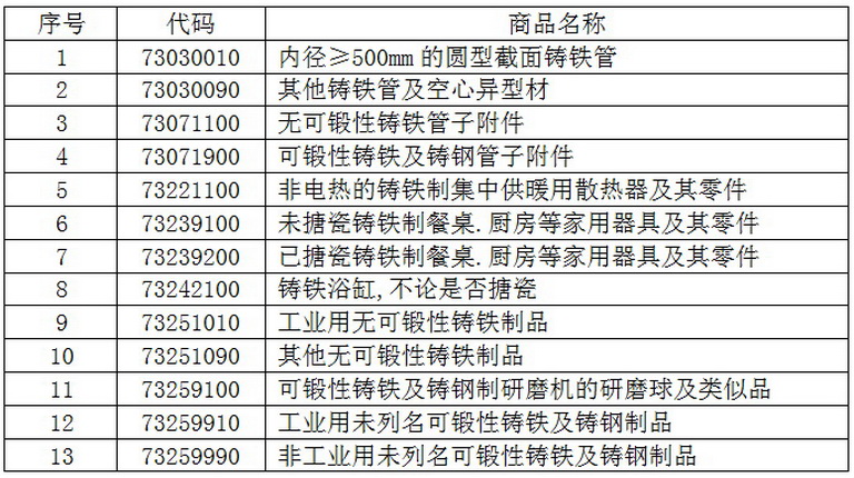 表 1:13個(gè)稅則號(hào)黑色鑄件